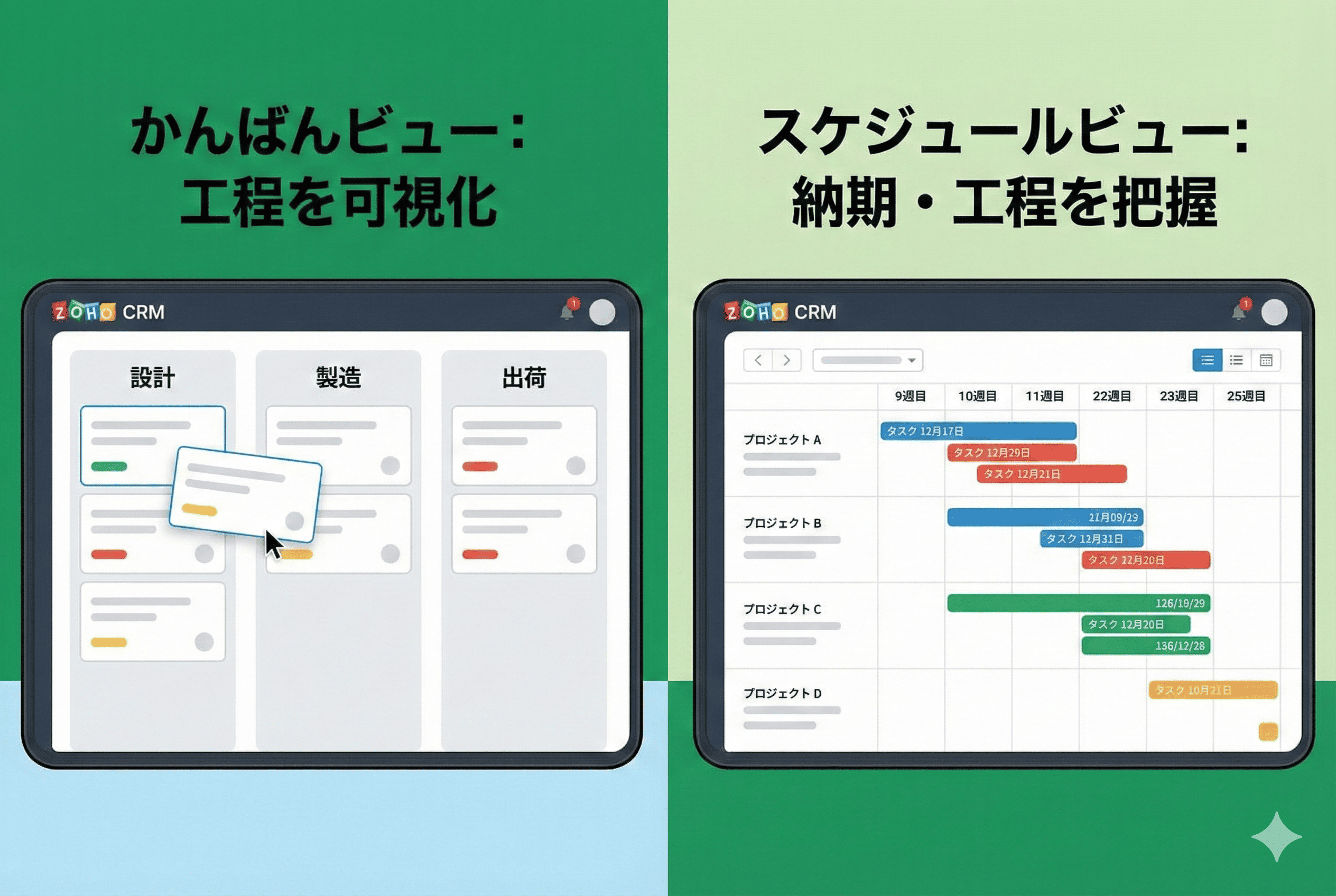 Zoho CRMの強みは、データの蓄積だけではありません。複雑な製造プロセスを直感的に把握できる「ビュー(表示画面)」が用意されています。