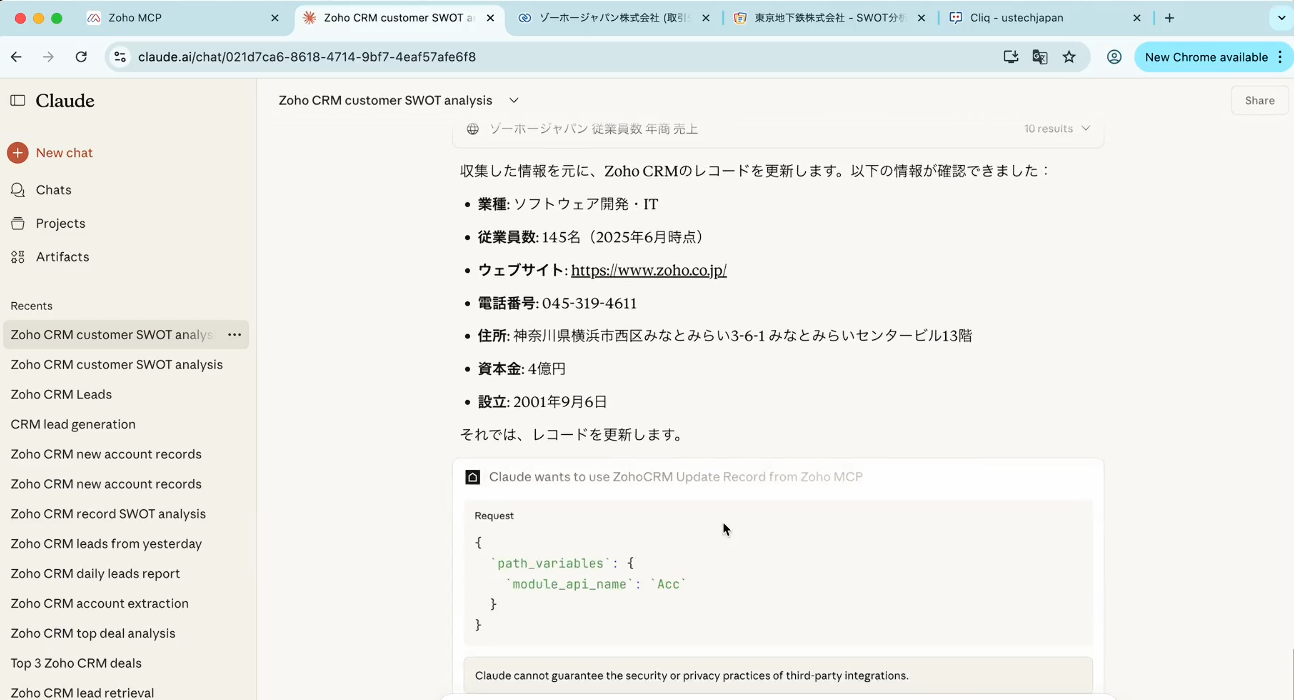 「Zoho CRMの取引先ID [XXXXXX](ゾーホージャパン)について、不足している情報(従業員数、住所など)をインターネットでリサーチし、CRMの該当項目を更新してください。」